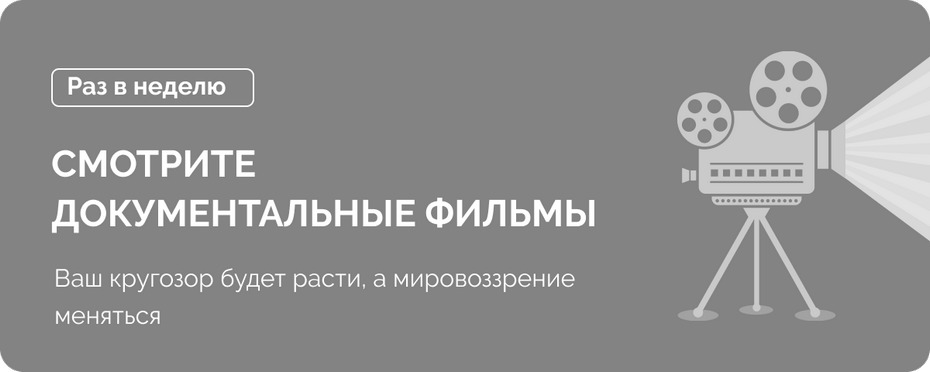 Вместо очередной комедии посмотрите кино о великом – о жизни на Земле, об истории интернета, системе Путина и т. д. Тем более сейчас документалка ни в чем не отстает от игровых и художественных работ. Режиссеры поняли, что люди хотят зрелищ и хлеба. И дают это своей аудитории! Они создают интересные работы, используя графику, спецэффекты, исторические кадры. После такого кино у вас всегда будет пища для размышлений.